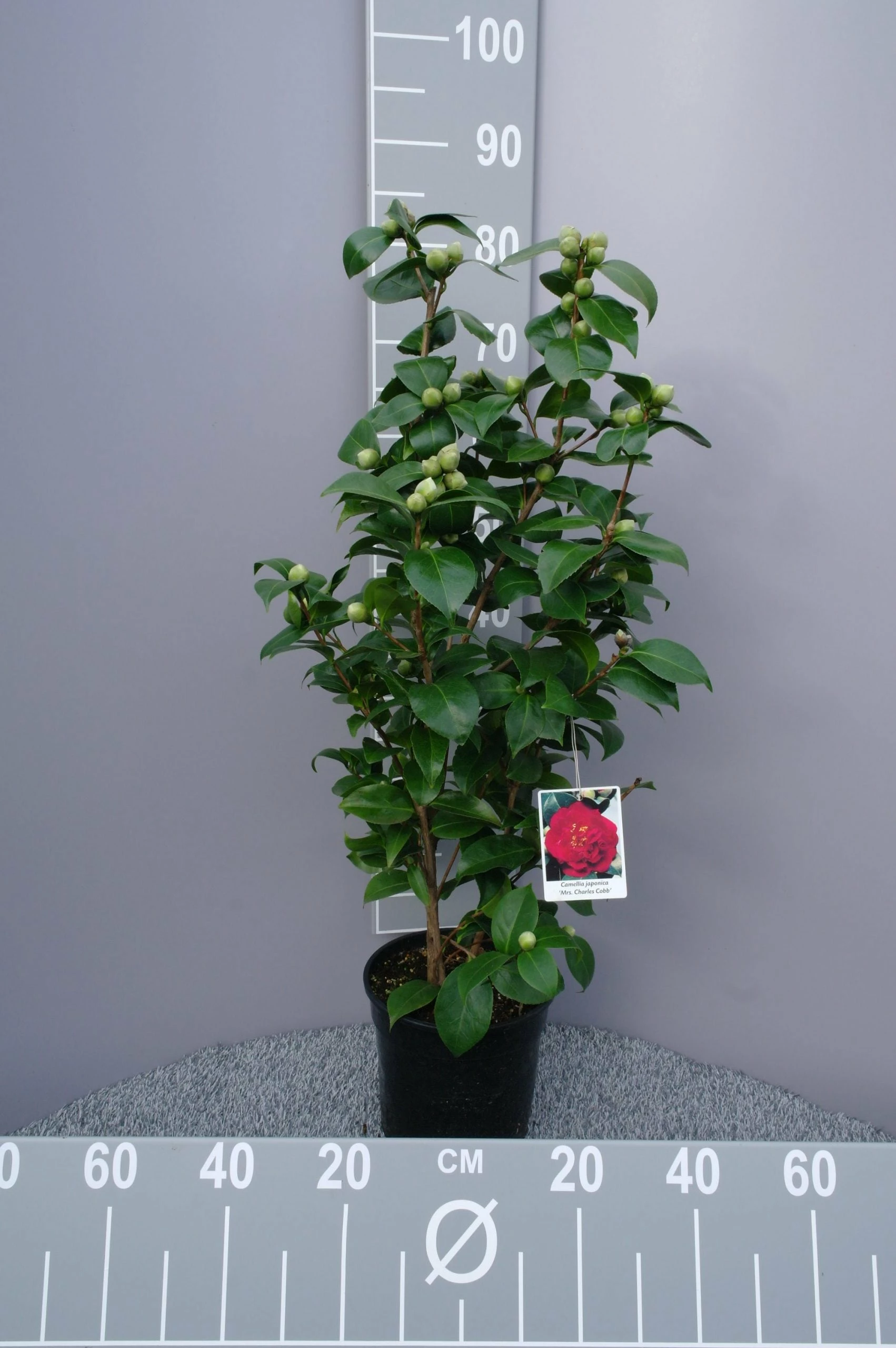 De Camellia Japonica ‘Mrs Charles Cobb’ is een bladhoudende heester met opvallende donker rode bloemen en donkergroene bladeren. Deze struik, ook wel bekend als de Japanse Roos, is een ware blikvanger door het kleurrijke contrast tussen de bloemen en het blad.