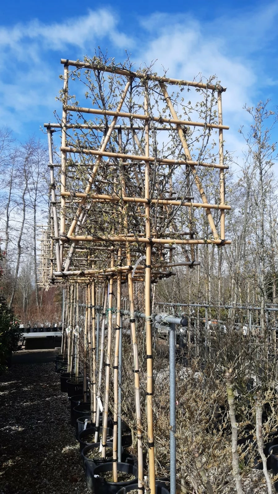 De Carpinus Betulus leiboom, met z’n fijne blad, bereikt hij na verloop van tijd een mooie dichtheid en is daarom erg geschikt als leiboom in schermvorm. In de zomer heeft hij klein lichtgroen gerimpeld blad, in de herfst kleurt het blad geel – oranje. In de winter verliest de haagbeuk zijn bladeren, maar de dichte structuur van de schermvorm geeft toch de nodige beschutting.