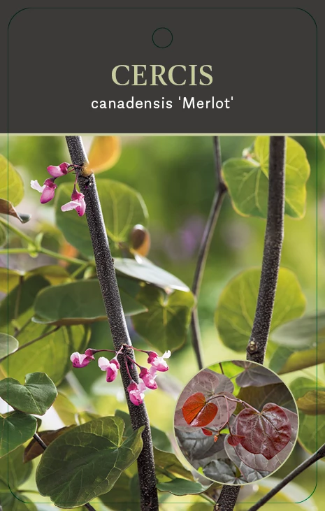De Cercis Canadensis ‘Merlot’ of Amerikaanse Judasboom kan ongeveer 300 cm hoog en breed worden. Het is een prachtige grote struik of kleine boom met opvallend grote hartvormige bladeren. Deze bladeren zijn eerst donker rood-purper waarna ze in de zomer wat meer richting groen verkleuren om in de herfst af te sluiten met prachtige oranje gele tinten. In het vroege voorjaar bloeit hij met roze bloemen op het kale hout. De peulvruchten vormen zich na de bloei en blijven bijna de hele winter aan de boom hangen. De standplaats is in de zon of halfschaduw.