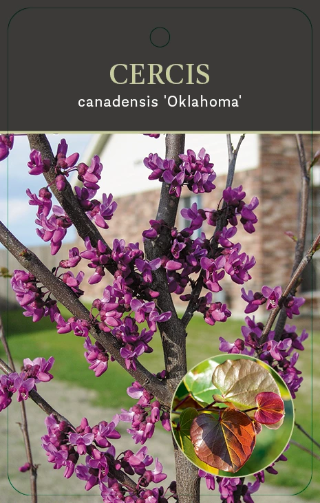 De Cercis Canadensis ‘Oklahoma’ of Amerikaanse Judasboom kan ongeveer 300-500 cm hoog en breed worden. Het is een prachtige grote struik of kleine boom met opvallend grote glanzende hartvormige bladeren. Deze bladeren zijn eerst oranje-rood waarna ze in de zomer wat meer richting groen verkleuren om in de herfst af te sluiten met prachtige oranje gele tinten. In het vroege voorjaar bloeit hij met roze tot wijnrode bloemen op het kale hout. De peulvruchten vormen zich na de bloei en blijven bijna de hele winter aan de boom hangen. De standplaats is in de zon of halfschaduw.