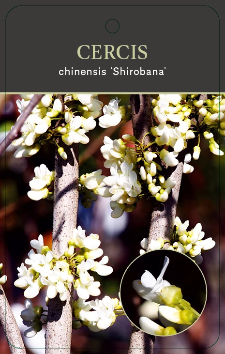 De Cercis Chin. Shirobana of Chinese Judasboom bloeit in april-mei met witte bloemen, na de bloei onstaan er peulvormige vruchten. Het blad is eerst grijsgroen en krijgt een mooie herfstverkleuring. Het is een bladverliezende struik. Hij wordt ongeveer 150-200 cm hoog. De standplaats is in de zon of halfschaduw.