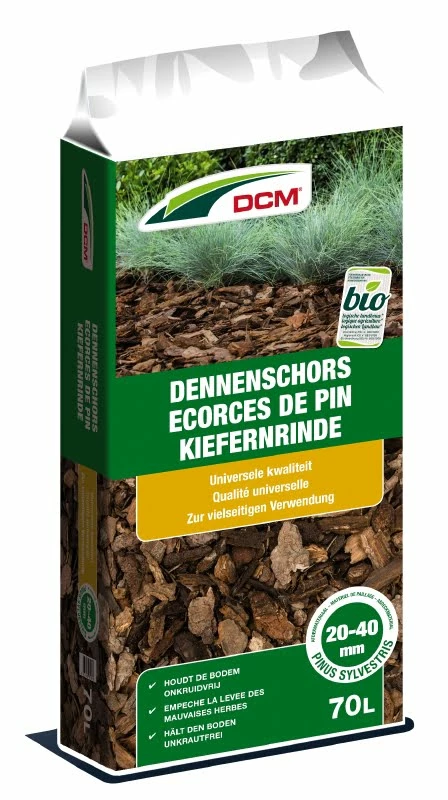 DCM Dennenschors (Pinus Syvestris) bestaat uit grovere stukjes natuurlijke dennenschors van 20-40 mm. Het voorkomt een snelle uitdroging van de grond en helpt de bodem onkruidvrij te houden. Bovendien zorgt het voor een mooi contrasterend effect met de planten. Het is zodoende een goed afdekmateriaal tussen de beplantingen Strooi DCM Dennenschors in een laag van 5-8 cm.