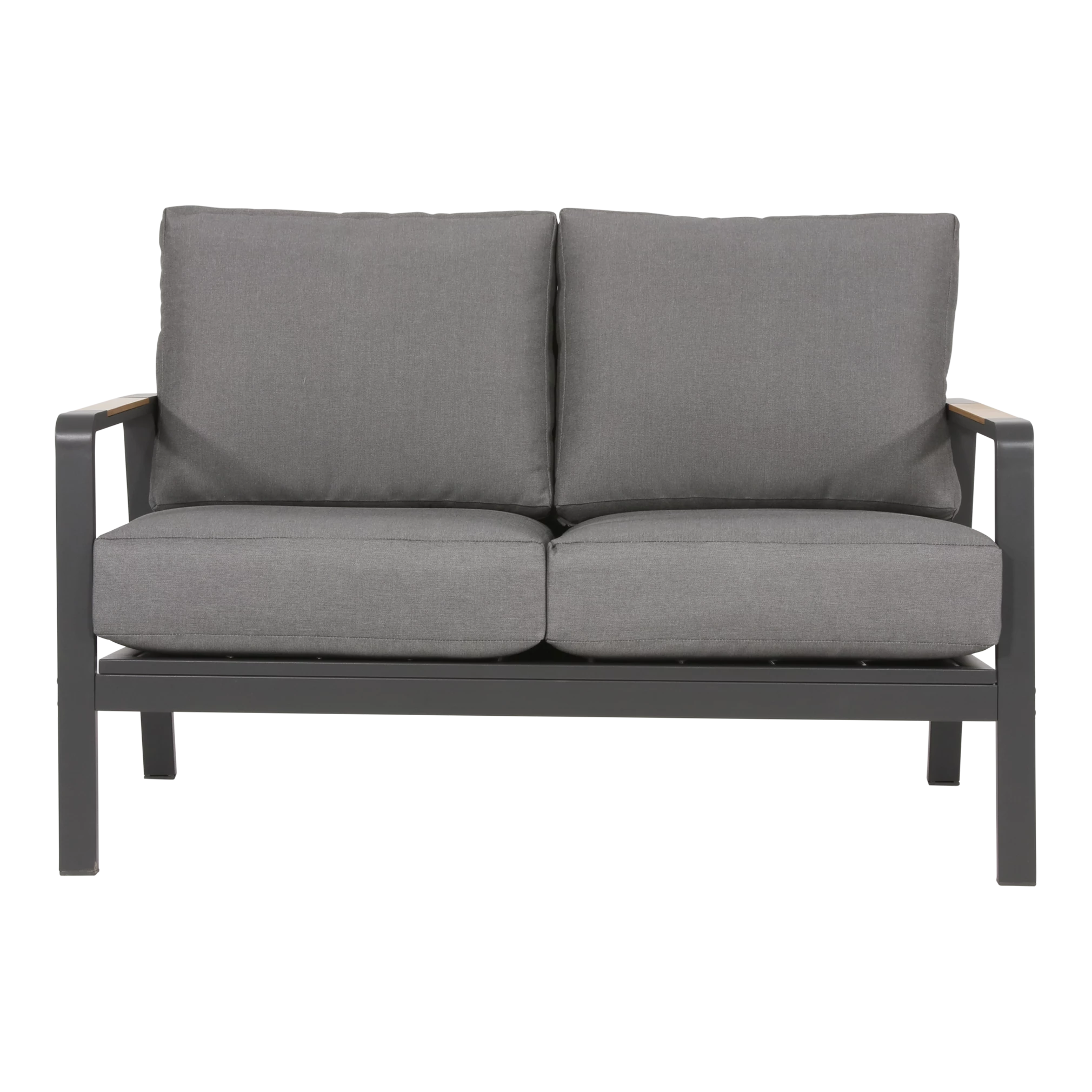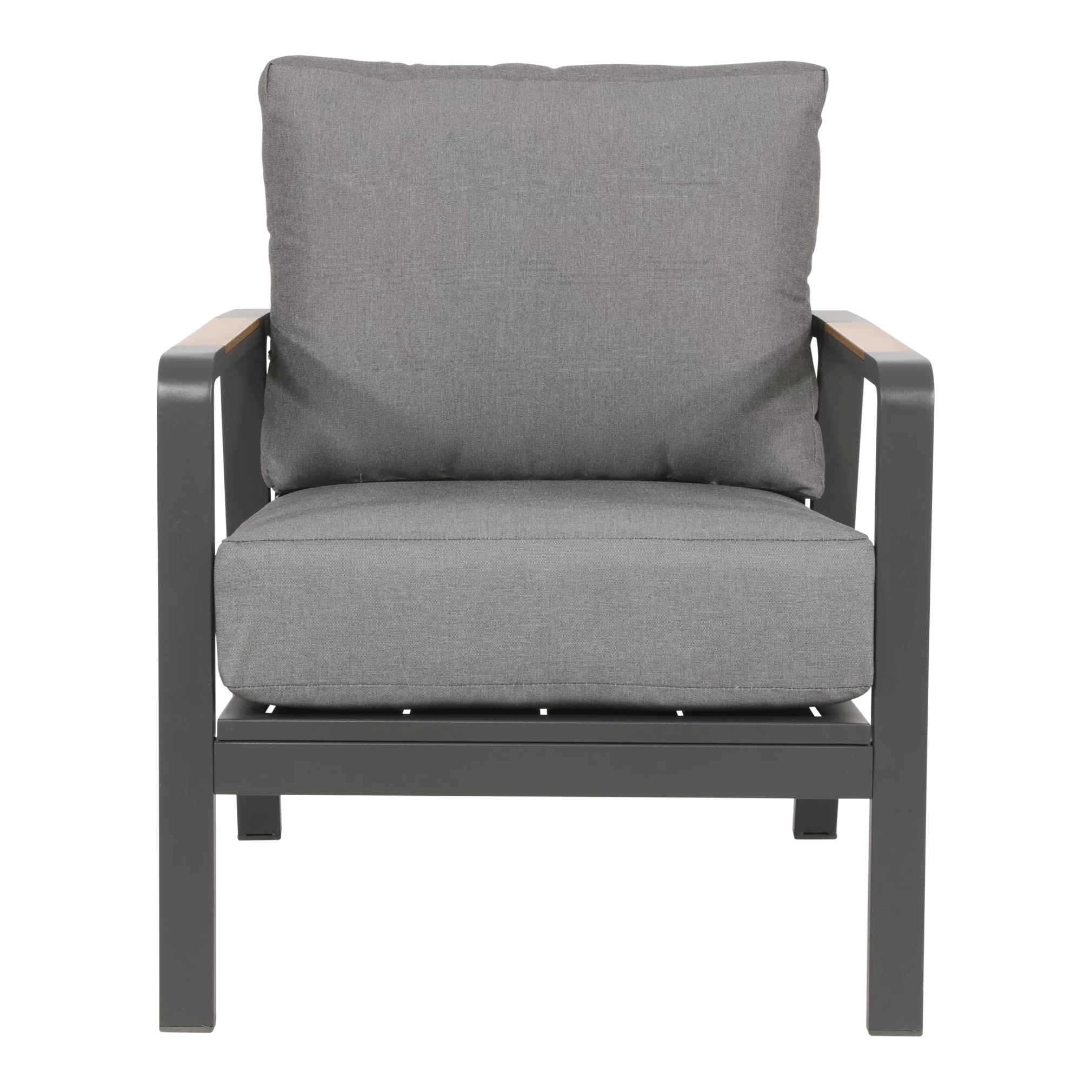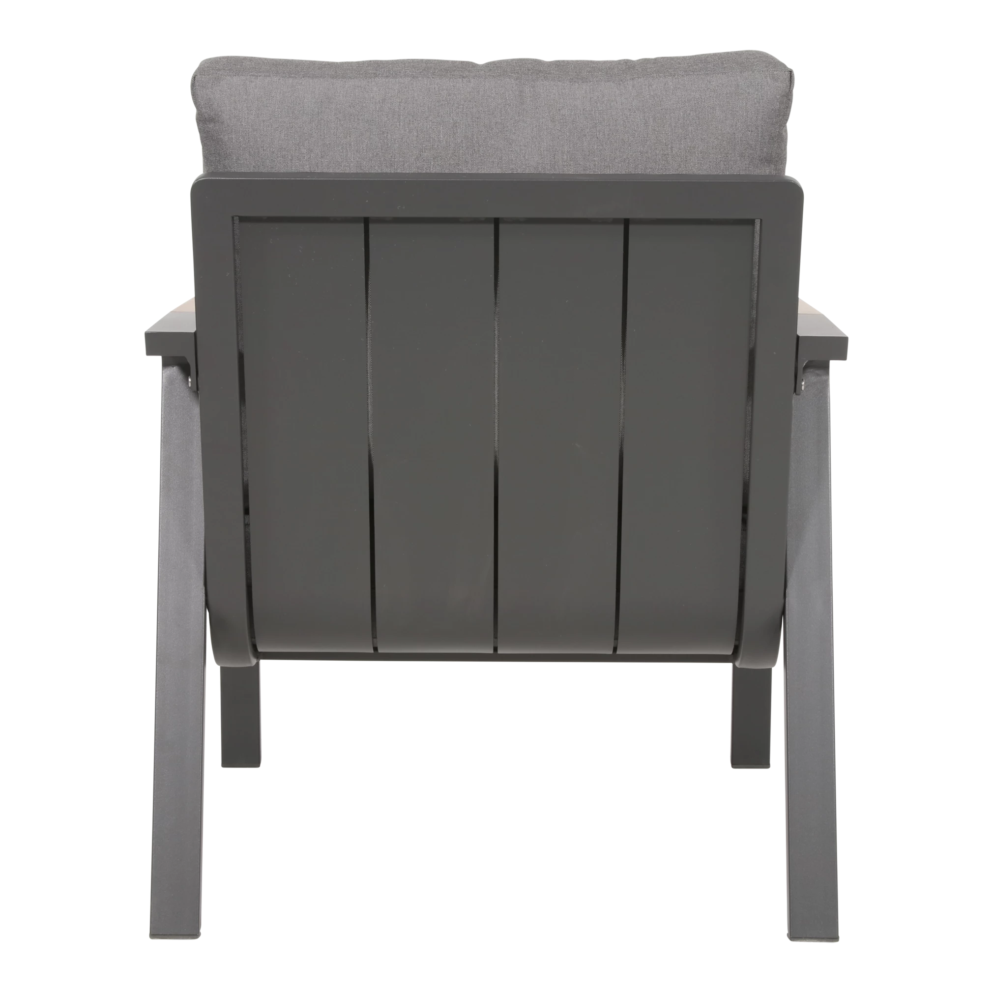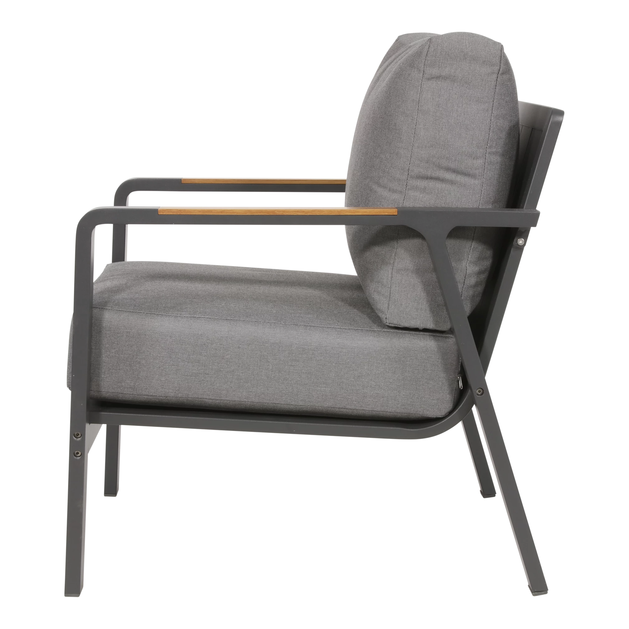 De Mai Tai loungeset bestaat uit een prachtige bank, 2 stoelen en een koffietafel. De loungebank en loungestoelen zijn uitgerust met een stevig en onderhoudsarm aluminium frame met een matte donkergrijze kleur als afwerking. Opvallend aan dit frame zijn de armleuningen, welke voorzien zijn van een decoratieve teaklook. Dankzij de fijne dikke en zachte zit- en rugkussens kunt u hier uren in vertoeven.