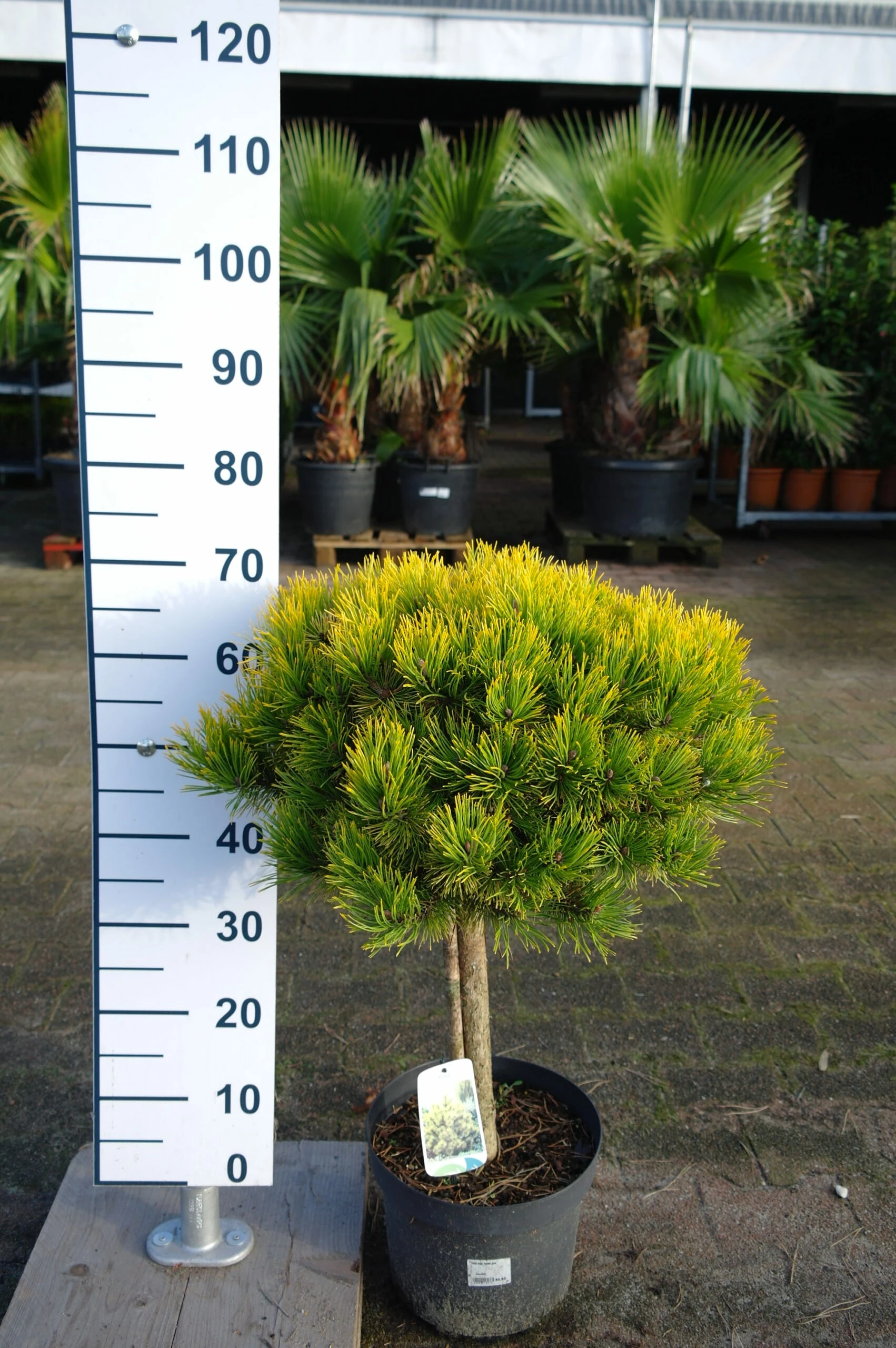 De Pinus mugo ‘Golden Glow’ op stam of Bergden heeft van de herfst tot in de lente mooie gele naalden, in het late voorjaar verkleuren ze naar groen. Nieuwe uitlopers zijn vrij lang voor een dwergsoort, ze kunnen wel 20-30 cm lang worden. Deze den zal door zijn felle kleur in de winter prachtig staan in combinatie met groenblijvende heesters met donkergroene bladeren of naalden omdat hij vooral in de winter een prachtig contrast vormt. De Pinus mugo ‘Golden Glow’ is een zeer sterke plant die houdt van een voedselrijke, droge tot vochthoudende, lichtzure grond in de zon of halfschaduw. Bij het planten van de Pijnboom kunt u het beste Tuinturf gebruiken.
