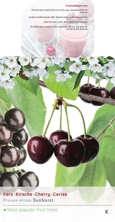 De Prunus avium âsunburstâ bloeit in het voorjaar met witte bloesem. De kersen zijn vrij groot, glanzend rood, sappig en zoet. Ze kunnen eind juli geplukt worden. Snoeien kan zowel na de bloei als na de oogst gebeuren, na de oogst is het het beste. De standplaats is in de zon op een luchtige, voedselrijke bodem. Natte standplaatsen worden slecht verdragen.