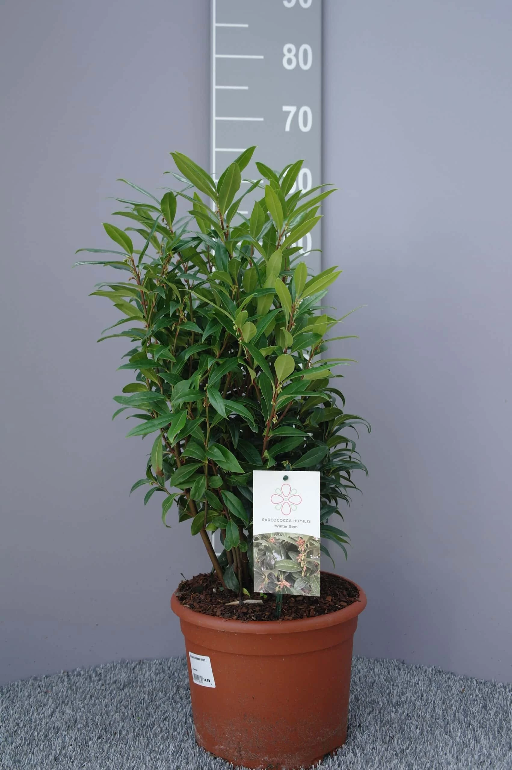 Sarcococca HookerianaWinter Gem of vleesbes is een juweeltje voor in de wintertuin. Het is een hele vroeger bloeier. In februari-maart bloeit hij al met sterk ruikende witte bloemetjes. Na de bloei volgen de zwarte besjes. Het blad is smal, donkergroen en glimmend. Het compacte struikje zorgt in borders en perken het jaar rond voor structuur. Zelfs voor potten en bakken is deze nieuwe zoete buxus een goede keuze. U kunt de Sarcococca Humilis Winter Gem ook in wat grotere vakken als sterke, bladhoudende bodembedekker toepassen, of bv als wintergroen haagje. Sarcococca Winter Gem is goed vertakt en zeer bossig. De uiteindelijk hoogte is 50-75 cm. De standplaats voor de Sarcococca is halfschaduw of schaduw.