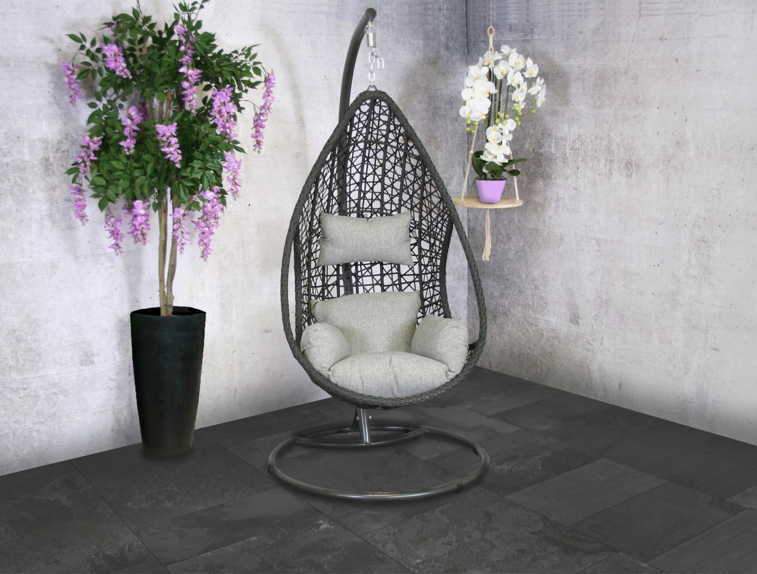 Helemaal wegdromen in deze opvallende en stijlvolle Mona Relax hangstoel. De hangstoel bestaat uit een eivormige stoel, gemaakt van prachtig gevlochten wicker en een stevige standaard. Door deze standaard kun je de stoel gemakkelijk verplaatsen en overal in de tuin neerzetten, in de schaduw, de zon, op de veranda of op je terras. Maar natuurlijk is het ook een plaatje voor in huis. De hangstoel is extra comfortabel door het dikke kussen op de zitting en het hoofdkussen. Je kunt het hangei hoger en lager hangen door middel van de stalen ketting.