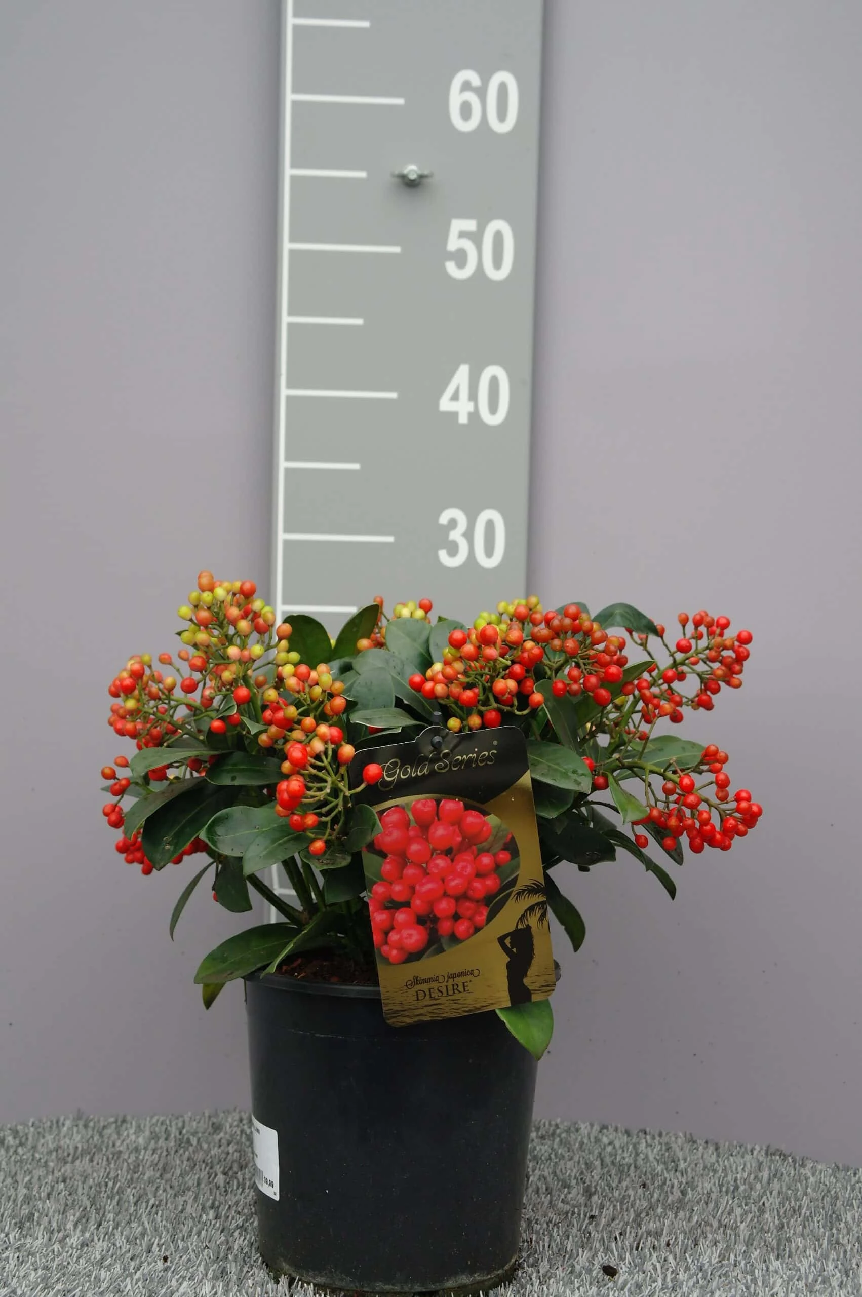 De Skimmia Japonica ‘Desire’ is een wintergroene sierheester. Dit is een vrouwelijke variant van de Skimmia. Ze bloeit in het voorjaar met witte geurende bloemen, na bestuiving van een mannelijke variant volgen de rode bessen die de hele winter aan de plant blijven, waardoor het een hele mooie opvallende heester is, het hele jaar door! Van de Skimmia worden de takken van vaak verwerkt in kerststukjes en winterboeketten. Hij is goed winterhard en ongevoelig voor ziektes. De uiteindelijke hoogte is 100 cm. Snoeien hoeft bijna nooit, omdat de ‘Desire’ een langzame groeier is. Na de bloei kunnen oude bloemen verwijderd worden. Om de compacte vorm van de tuinplant te behouden, kunt u de oudste takken wegsnoeien en de jongste topjes een klein stukje terugnemen meteen na de bloei.