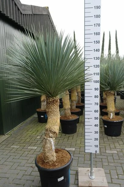 De Yucca Linearifolia heeft een zeer kenmerkende stam door het oude hangende bruine blad. De kroon bestaat uit vele smalle grijs/blauwe bladeren. De kroon wordt steeds voller en mooier. De Yucca Linearifolia kunnen de Nederlandse winters goed aan, ze zijn namelijk winterhard tot wel – 18 graden. Bescherm de kroon in de winter wel voor te veel vocht/sneeuw. De standplaats is in de zon. Hij houdt niet van veel water, zorg dat de grond goed gedraineerd is. De Yucca Linearifolia is echt een indrukwekkende, exotische plant voor in uw tuin maar staat ook erg mooi in een pot op uw terras of balkon.